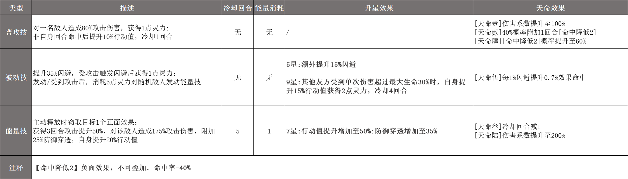 3)能量技:主动释放时窃取目标1个正面效果,获得攻击提升50%、穿透35%、行动值提升50%(7星效果)