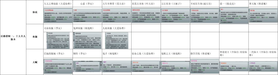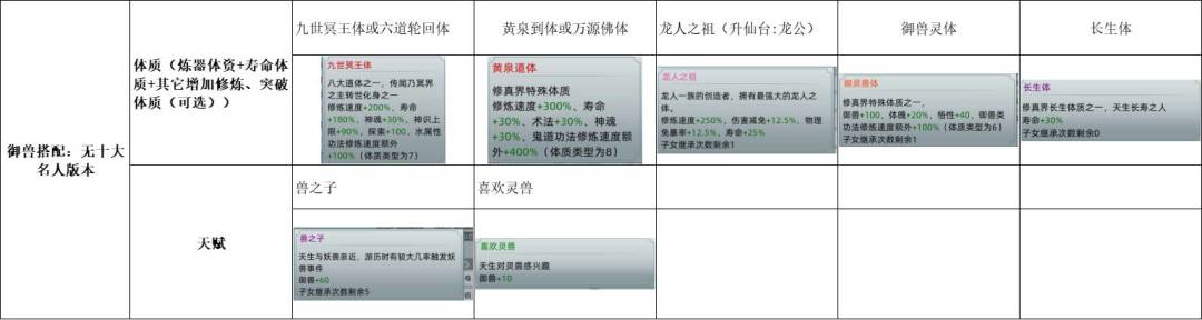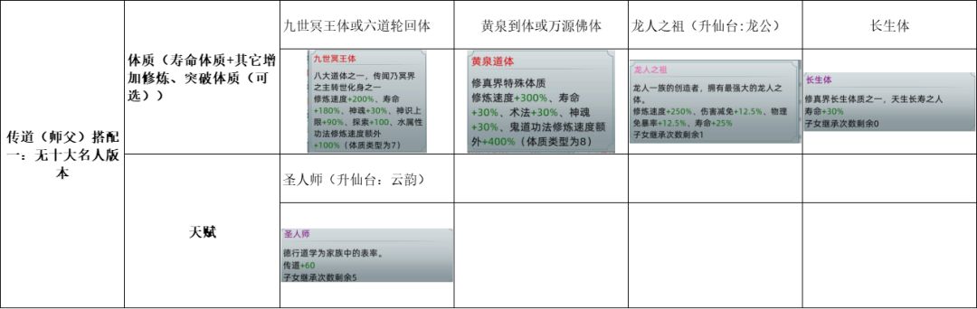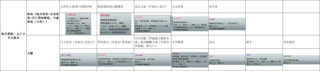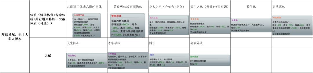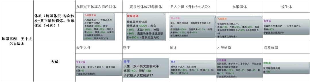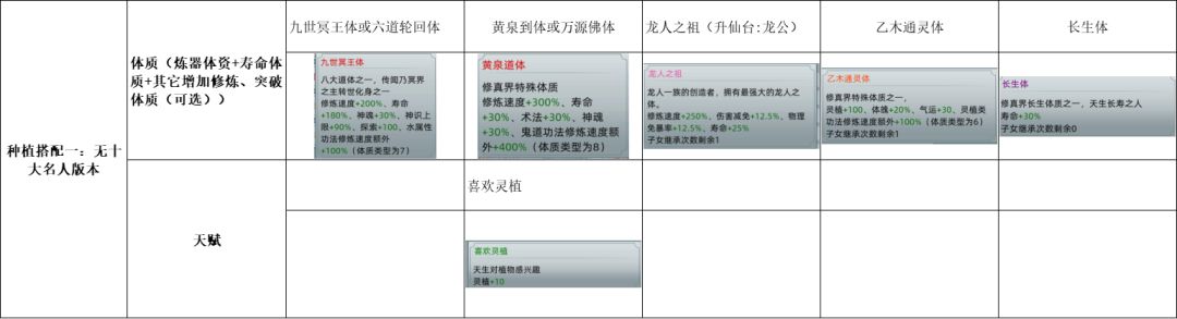 为了玩这游戏,查了论坛和贴吧大量帖子,做一个汇总整理帖子,这里只统计了可遗传后代的数据,无法遗传的体质和天赋没有列出来。功法搭配还没弄清楚,先不整理了。