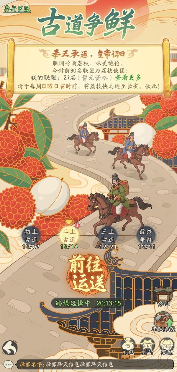 贵妃思慕岭南荔枝,陛下特令各联盟担任“大唐荔枝使”,于每周日将新鲜荔枝急送长安。