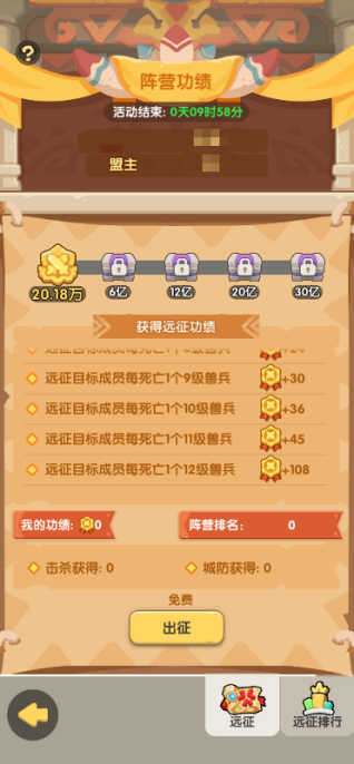 这是首次进入远征的界面,可以看到本阵营的功绩进度、功绩获取方式、个人功绩、排名。