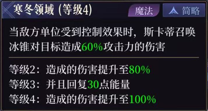 同时又和技能【寒冬领域】形成互补:如果有受到控制的敌人斯卡蒂会对其造成额外伤害并回复能量。