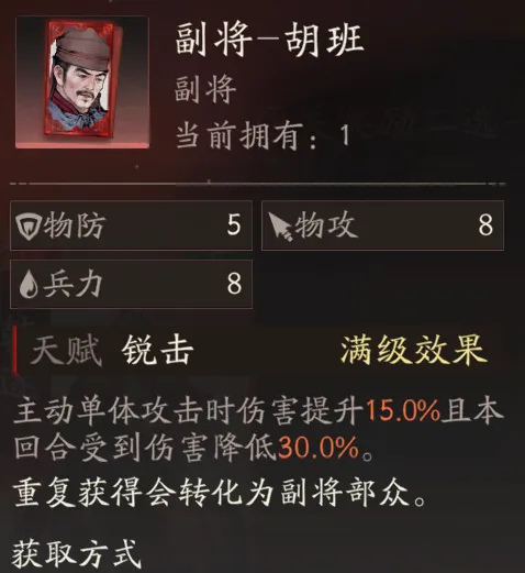 先说下胡班天赋"本回合受到伤害降低30%"效果,这个实测文案描述不够准确,实际效果并非当前行动的大回合,而是携带武将主动攻击时、本次受到的反击等伤害时生效。