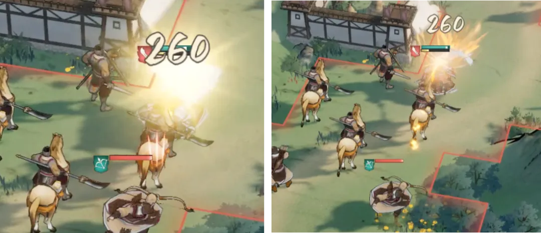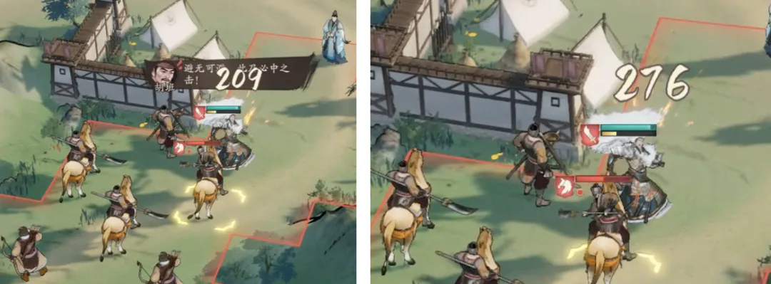 如下两张图,在主动攻击时,左侧携带胡班享受到减伤效果,受到伤害低于右侧。