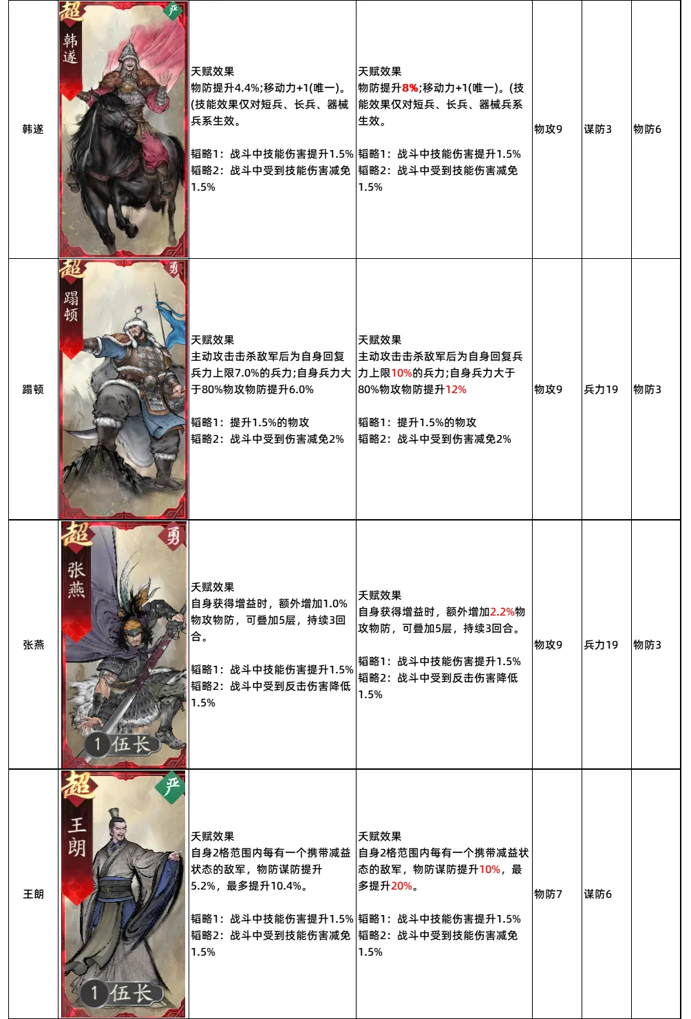 作为生存向的副将,韩遂天赋给的属性加成并不算高,与其他有物防属性的副将相比,韩遂天赋给的物防面板整体是最低的。