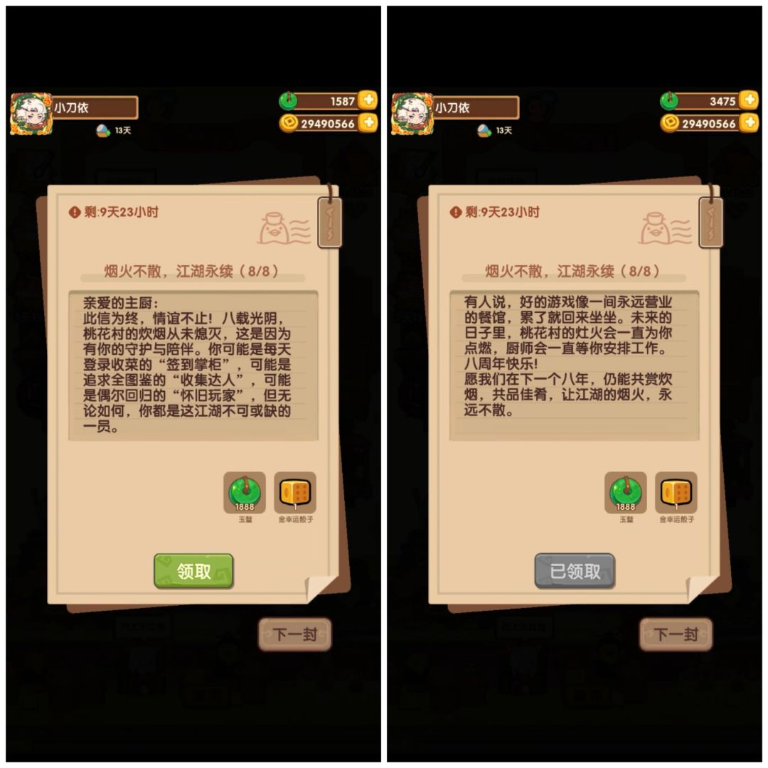 八封邮件玉璧888+888+1314+520+666+999+888+1888=8051,还有金骰子,金上上签和三个菜谱(其中一个菜谱是八周年蛋糕)。总计送了24405玉璧。