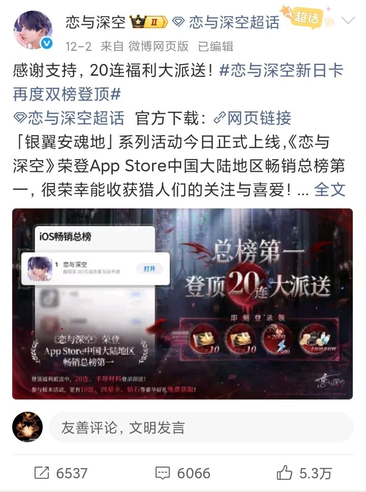 12月2号,秦彻新卡让《恋与深空》再度登顶App Store中国大陆地区双榜第一❗❗❗