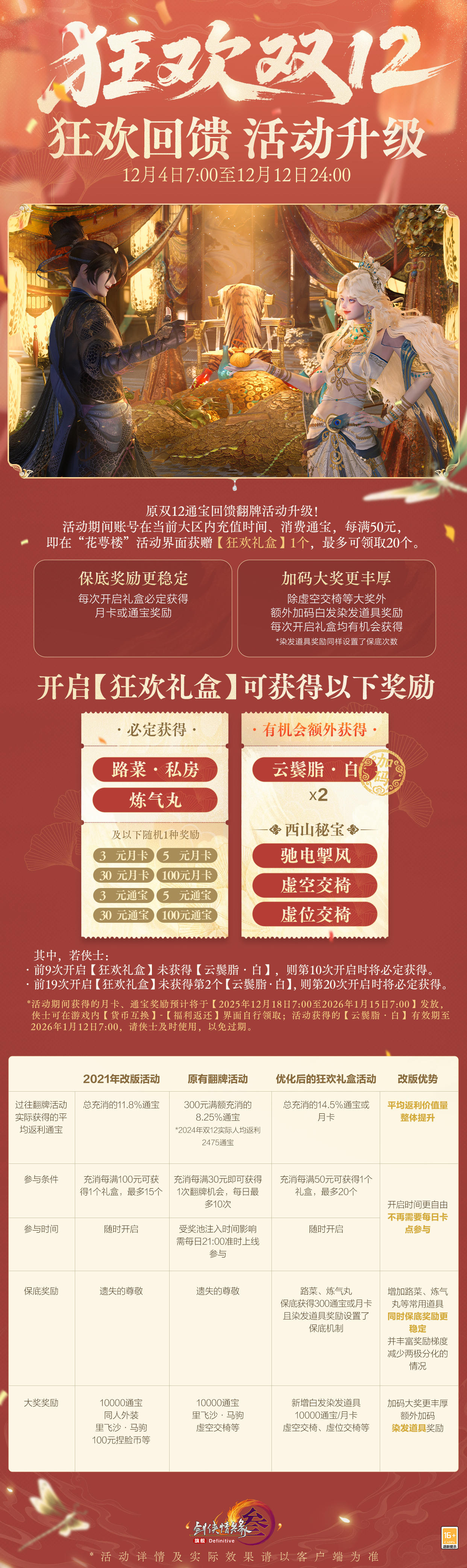 狂欢双12盛典重磅来袭,超多特惠活动12月4日开启!其中,通宝回馈活动同步升级,活动期间充消每满50元即可获赠【狂欢礼盒】!全新【狂欢礼盒】基于此前回馈活动进行优化: