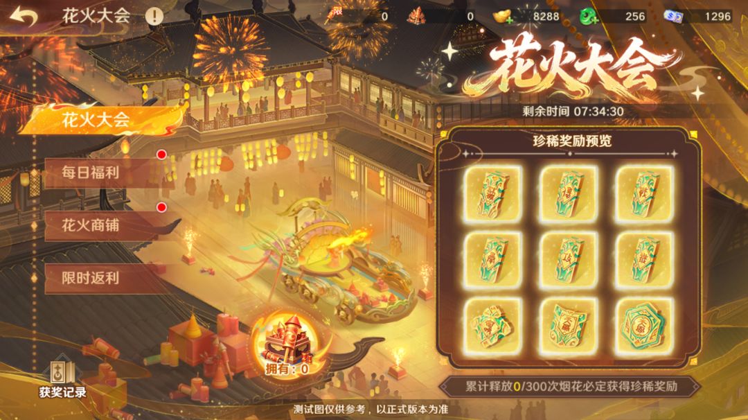 活动期间,守护使大人可在此界面点击下方烟火形状图标,消耗活动道具「流萤花火」和「璃光花火」来抽取奖励,奖励包括超稀有道具「金色铭文」,以及八大红将任选箱,九千年蟠桃,灵宝任选箱,剧场礼花,铸魂仪,太虚骑装二选一,铸真玄金,紫霄锻谱,至尊铭文原胚任选箱等珍稀道具。