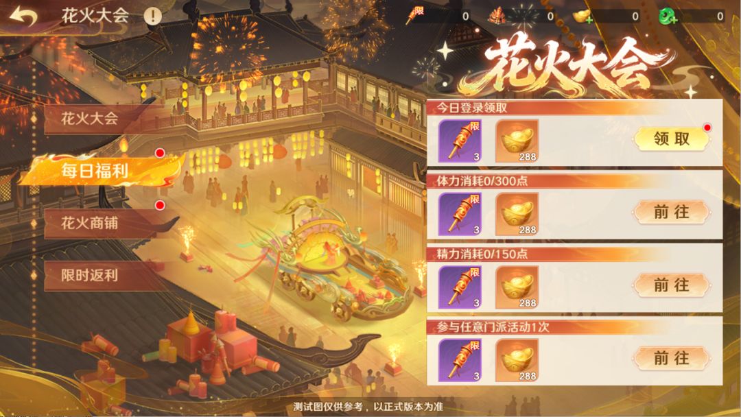 在花火大会活动持续期间,完成每日福利板块内的任务,即可领取流萤花火和元宝奖励。任务每日刷新。