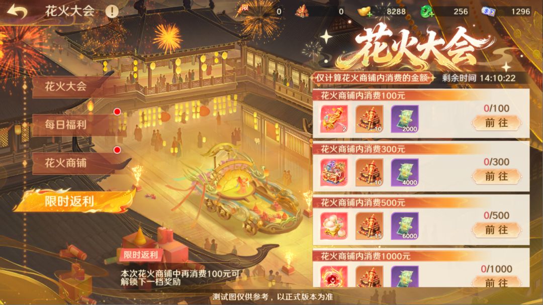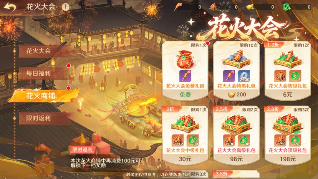 活动期间,守护使大人在花火商铺中消费达到指定的金额后,即可领取返利奖励,灵宝任选箱、九千年蟠桃、八大限定红将任选、绯灵诀、金色特性铭文任选箱等道具你来拿!