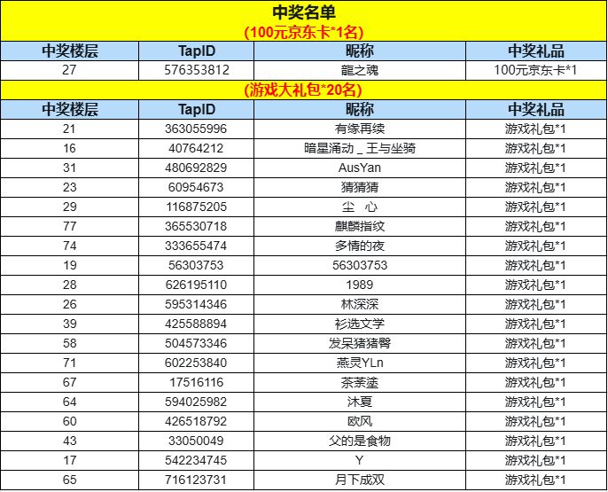 开奖啦!*恭喜以下21位冒险者在本次活动中中奖!
