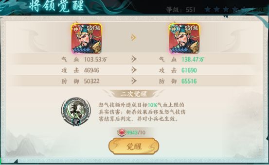 武将觉醒能提升将领的【怒气技】效果,从而能获得更强大的能力,根据武将不同觉醒后的效果不同。
