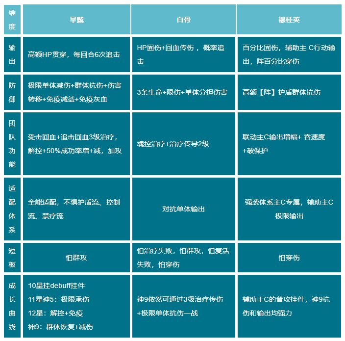 结论:输出端旱魃的优势一骑绝尘:对比可见,旱魃拥有300%HP穿伤+真伤且群体,远大于穆姐的群体70%HP穿伤,以及白骨的300%HP固伤。且旱魃的追击触发门槛低,队友行动就跟着出手,能够很快补足伤害,比穆姐的受击10次、白骨的概率追击都要迅速和有效。当然,衡量一个战士的核心标准并不是由输出决定,更主要是防御,而旱魃的防御端比输出端优势更加显著!