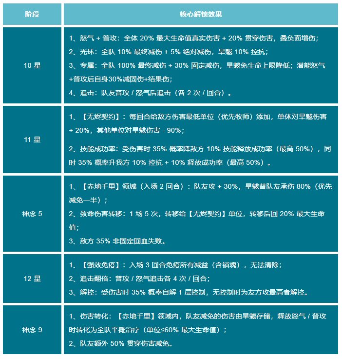 总结:11星神5具备“输出穿透、防御壁垒、成功率+解控双辅助功能” 的全能特质。12星激活“强免+解控+双倍追击”,额外提升行动力和生存能力。神9奠定“移动泉水+群挡穿透”,兜底全队生存能力。