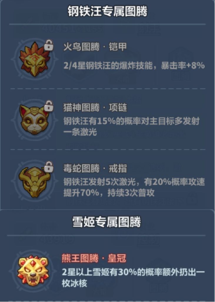 推荐首选钢铁汪的专属图腾,【2/4 星钢铁汪的爆炸技能暴击率增加】【概率多发射额外激光】【概率攻速提升】来增加钢铁汪的伤害。推荐携带雪姬【概率额外扔出额外冰核】的专属图腾来增加控场时间。