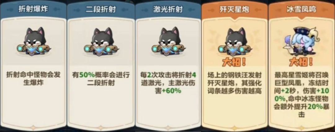 优先解锁钢铁汪【激光折射】技能,才能解锁后续「折射类」词条,如折射爆炸,折射过载等,如果没有折射技能,也可以选择射线手雷和精准打击等增伤技能,它们在清怪和对抗首领时同样表现强势!