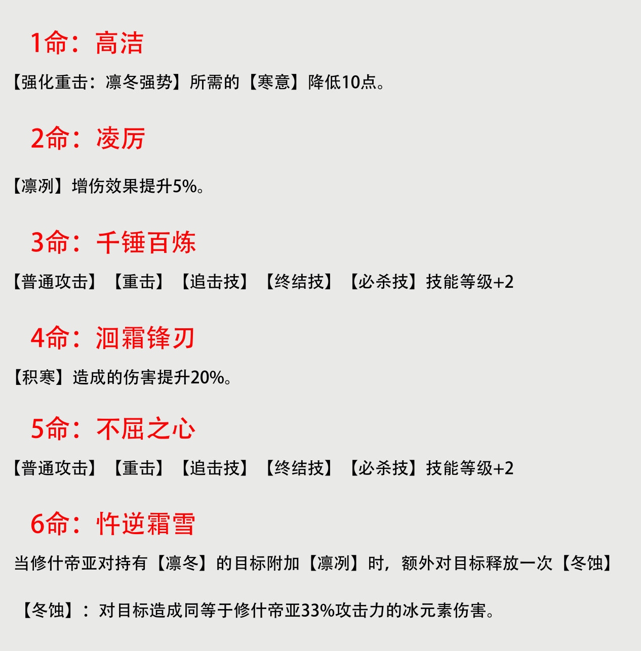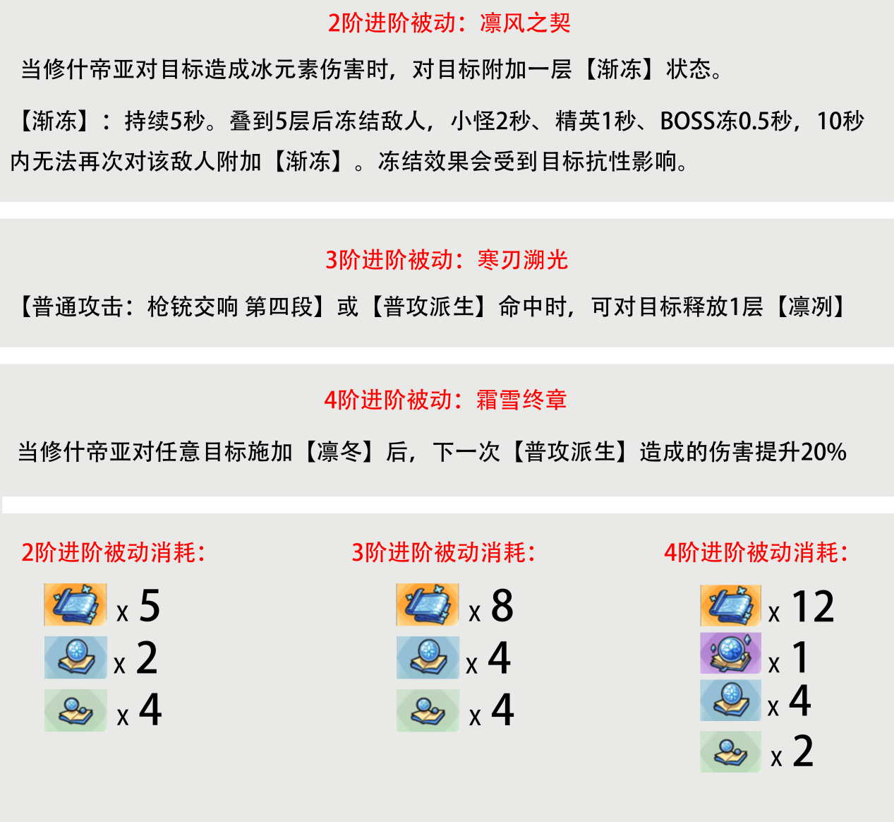 一命【寒意】消耗降低就能让修什帝亚进入叠出【凛冽】以及后续衍生的状态,都知道修什帝亚对【凛冽】状态的目标造成的伤害会有提升。