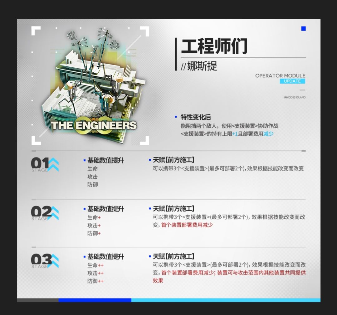 娜斯提模组效果,2级的首个装置部署费用是减少2。3级模组效果装置可与攻击范围内其他装置共同提供效果。其实就是演示的时候可以把第二个装置朝向第一个装置。可以共同加成第一个装置朝向的干员。不过这样的话,你要使用这个效果就必须要开3级了。3技能的造高台感觉可以不用这个效果。