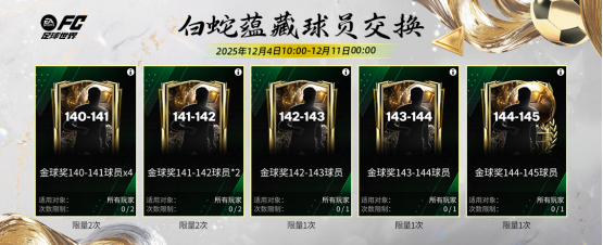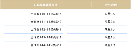 本周四更新后,白蛇蕴藏球员交换将会迎来金球奖活动的相关球员卡池,玩家可以使用对应条件的球员卡参与交换,,获得140-145能力值的金球奖球员,各卡池内容及可参与次数如下: