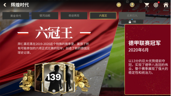 本周四更新后,辉煌时代活动将会开启六冠王章节,在本章节中,玩家可以通过参与活动获得辉煌时代球员卡奖励,同时伴随本章节的开启,我们也将迎来由多位拜仁慕尼黑传奇、现役球员领衔的辉煌时代 团队2。