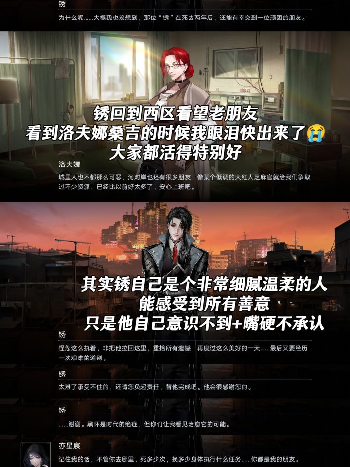 其实锈是一个非常非常细腻的人,对于所有的温情和善意都记在心里。比起那些沉重的黑环、狂厄、地底、立场,他自己内心深处最眷恋的还是那些阳光下的、人与人之间真心的羁绊(只是他自己意识不到或不愿承认罢了)。