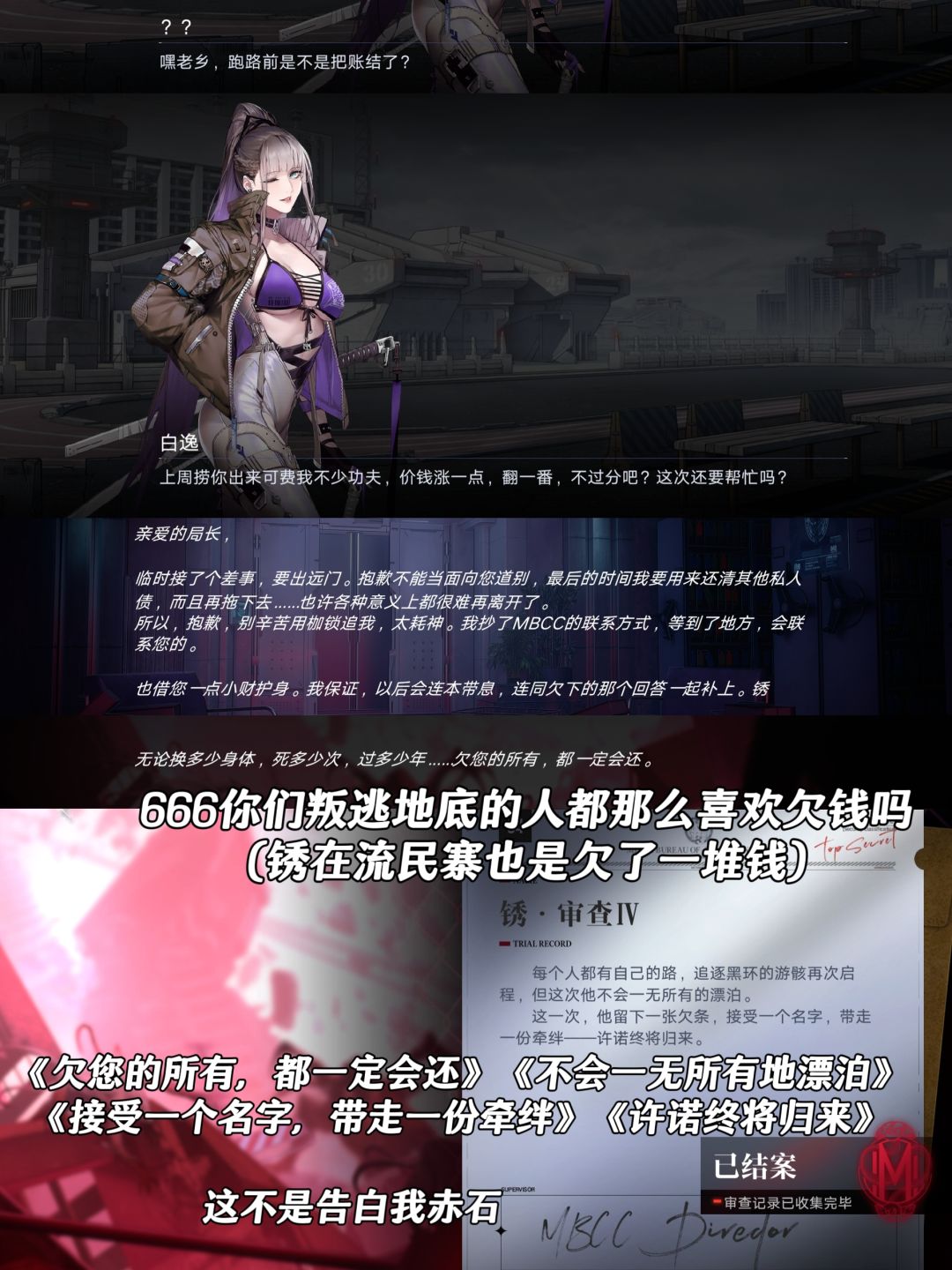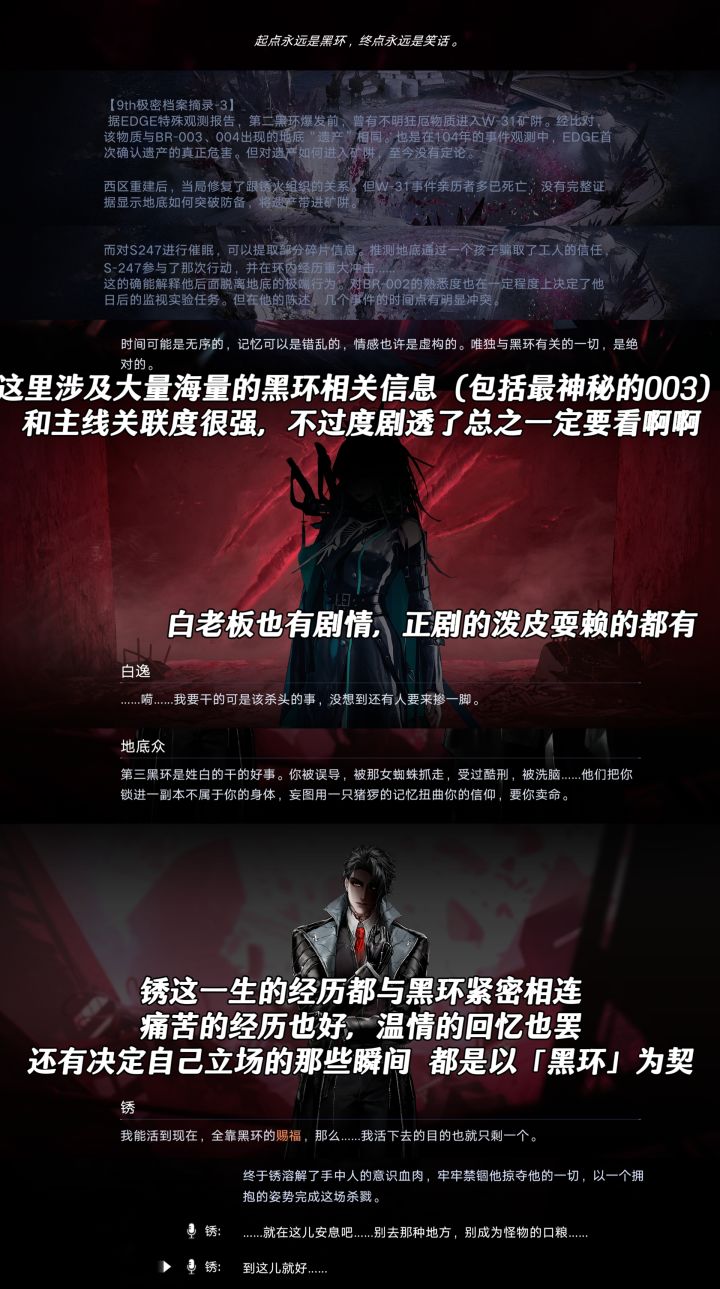 就算抛开小局和锈之间的互动不谈,这个审查也很有看的必要,补充了大量地底势力和黑环相关的世界观信息。包括br003的爆炸是地底筹备了十年的结果,但地底的目的没有最终达成、 003最后还是被egde回收,都是因为锈在其中的作为。还有更多就不剧透了(比如br002首次爆发的信息、地底真正供奉的那个牧羊人等等)。