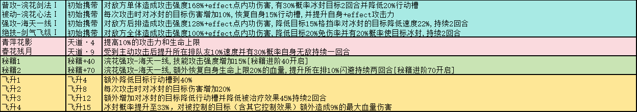 优秀领先的秘师基础速度,强攻清后排优势明显,少有的增幅强攻秘笈角色;自身携带极强的控制效果,普攻合绝技都能有效的对敌人进行控制和输出,技能对敌人免伤和格挡进行削减,被动对自身行动有着极强的提速,对队友提速和少量闪避具有较强的联合效果,加上对冰封的额外伤害以及绝技对控制的额外流血伤害,合适场景输出极强。