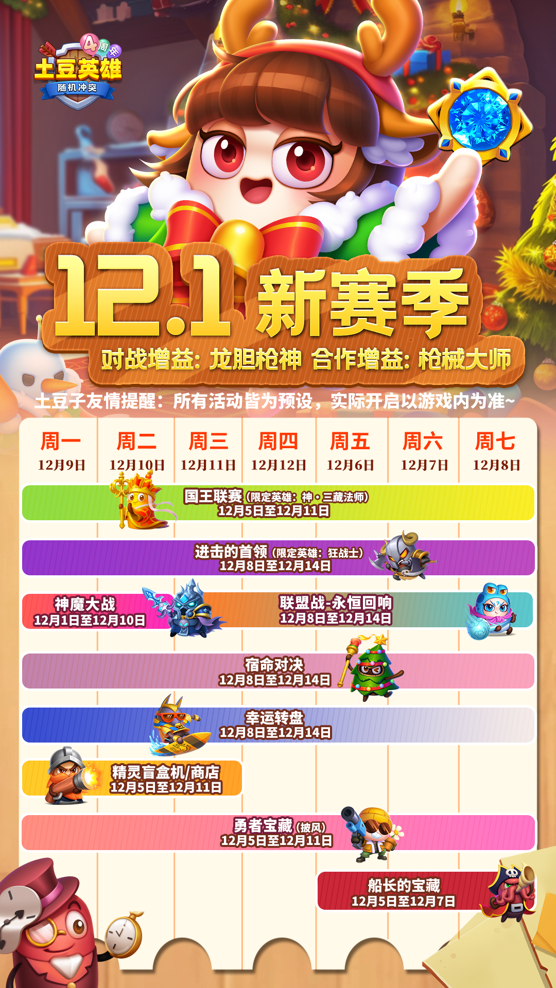 12月上旬赛季的对战增益英雄为:龙胆枪神,合作增益英雄为:枪械大师