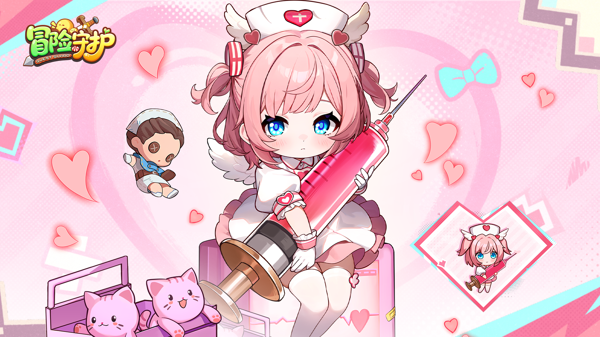 头戴俏皮护士帽,粉色短发扎成两个可爱的小揪揪~粉白的护士装非常合身,怀抱超大萌趣针管的她眨眨眼,连身后的小翅膀都扑闪着温柔光芒!🎀 这次的治疗,是心动还是心跳加速呢?