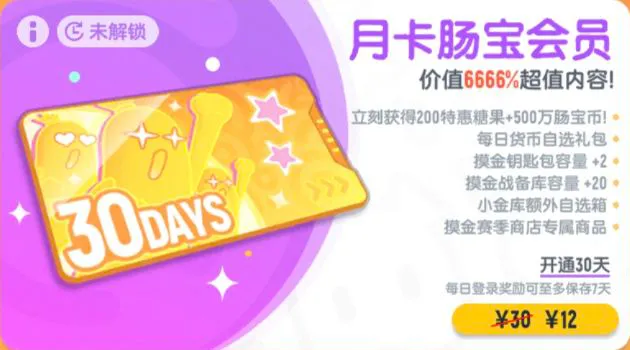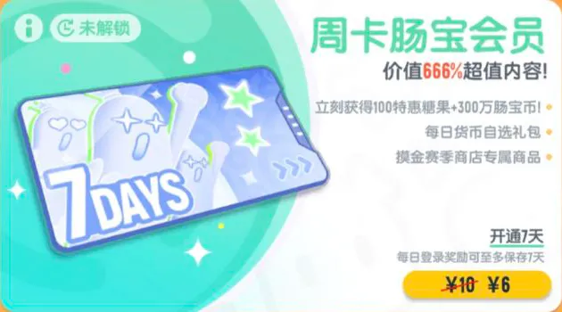 肠肠开通周卡肠宝会员后,将立即获得一份价值达666%的超值奖励组合,其中包含100特惠糖果与300万肠宝币,每天登录还可领取肠宝会员自选礼包,并同步解锁摸金赛季商店专属商品