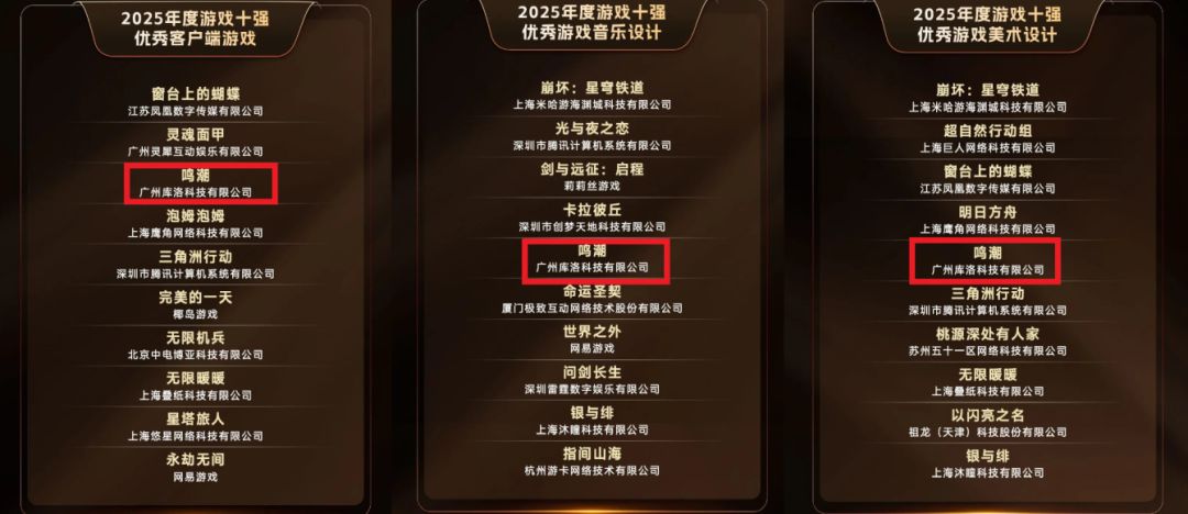 近日,中国音数协游戏工委正式发布“2025游戏十强年度榜”提名名单,库洛游戏旗下开放世界动作游戏《鸣潮》表现亮眼,一举斩获三项重磅提名,涵盖“优秀客户端游戏”“优秀游戏音乐设计”“优秀游戏美术设计” 三大类别,成为本次评选的焦点之一。