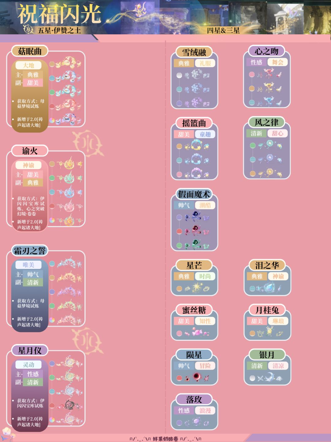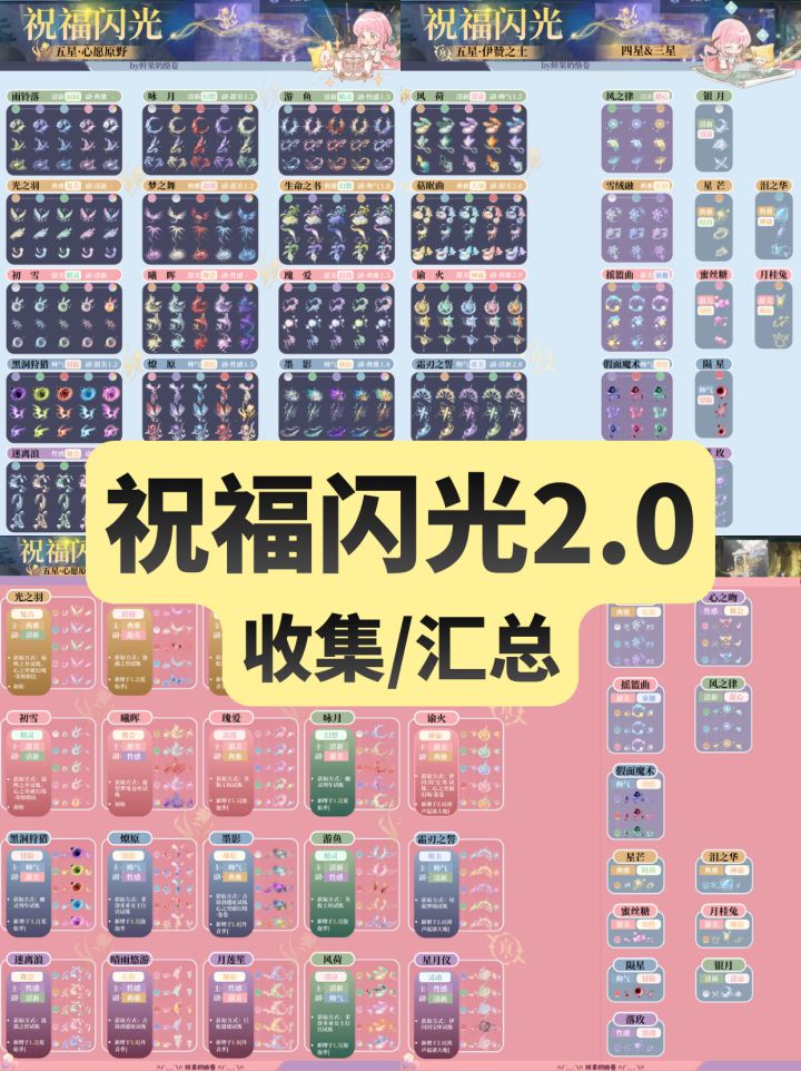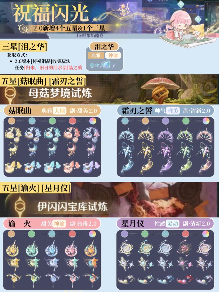 2.0版本新增4个五星祝福闪光:菇眠曲、霜刃之誓、谕火、星月仪,1个三星祝福闪光:泪之华;