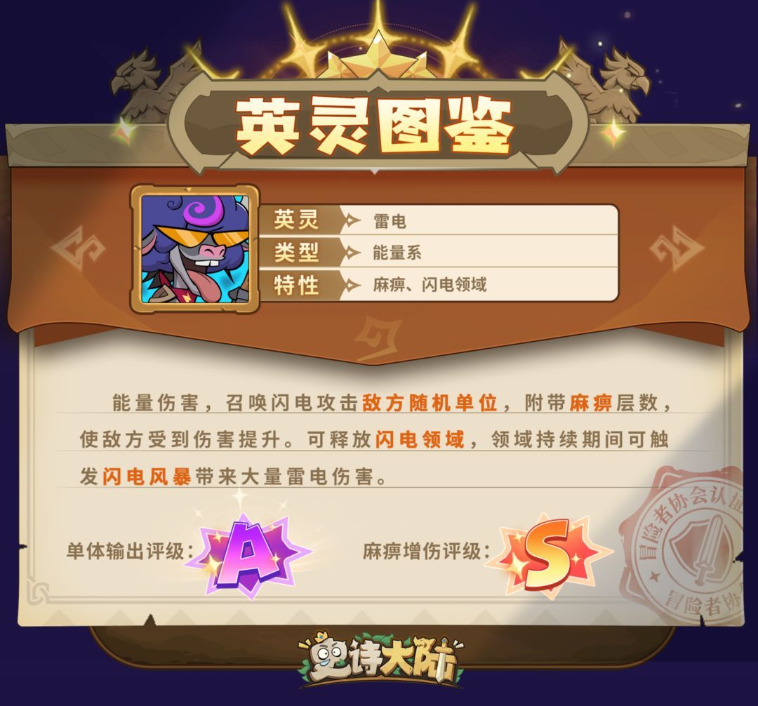 雷电英灵也是一名对群对单都强力的能量系英灵(不是元素系哦~),可以通过触发落雷、闪电风暴、麻痹增伤等方式越战输出越高。建议优先提升至3级和9级,解锁【落雷】和【闪电风暴】,就能解锁雷电两大最核心的输出技能。如果英灵等级拉到18级,就能解锁被动技能【麻痹】,技能攻击附带麻痹层数,此时雷电英灵已完全体解禁,可以释放他最大的伤害潜力。