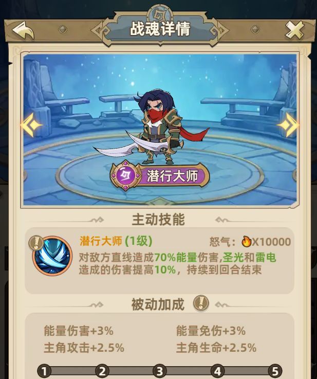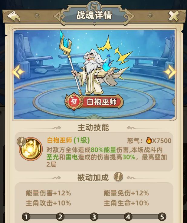 3.战魂-白袍巫师、女武神、潜行大师、蓝胖(以下战魂品质由高到低介绍,技能效果为基础数值)白袍巫师-高额全体能量伤害,最高60%雷电增伤。