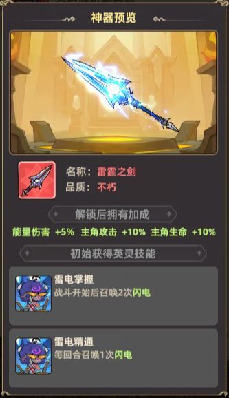 2.神器-雷霆之剑能为冒险者提供能量增伤和基础属性,同时提供开局即可获得的【雷电掌握】和【雷电精通】两大核心技能,入场就唤来电闪雷鸣。
