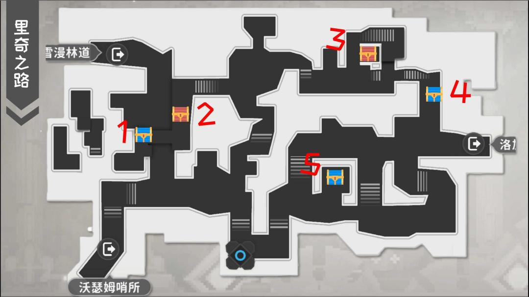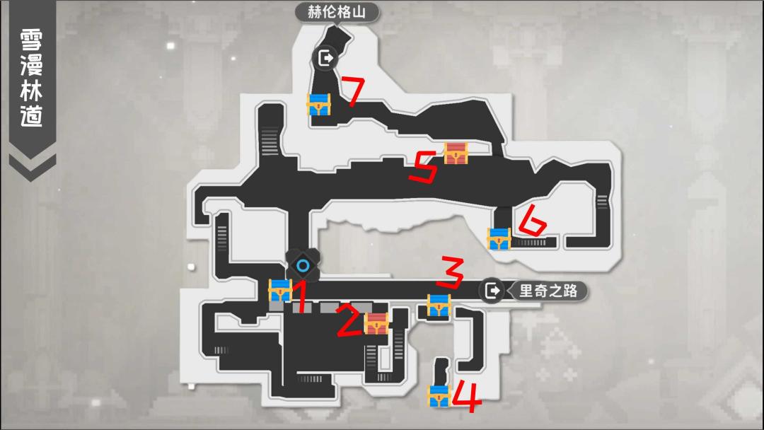雪漫林道灵生花2、覆雪菌3、熊珥花6;起点于传送点,先绿后紫,上入赫伦格山;赫伦格山因果实较多,地形交错,分两图表示;灵生花2、夜见藤4、覆雪菌4、熊珥花4;由雪漫林道来,左入希罗洞窟;...