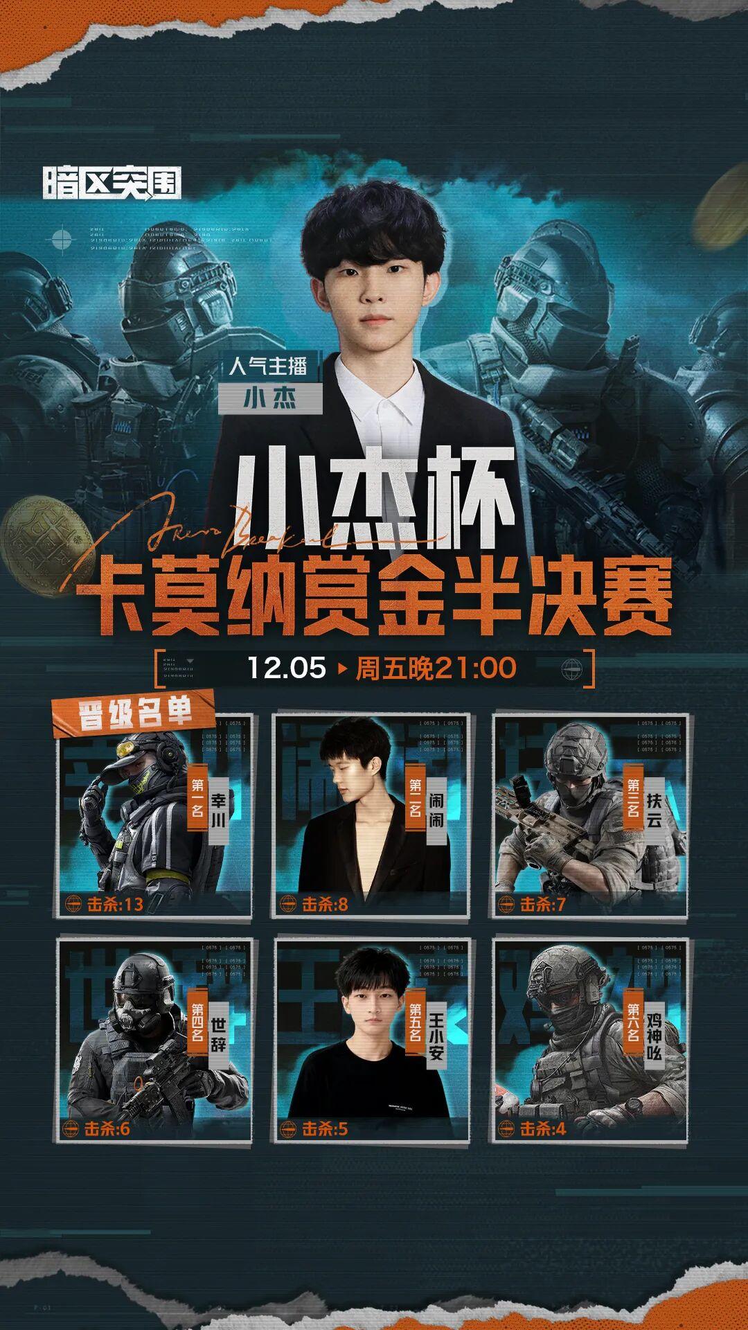 【小杰杯卡莫纳赏金赛】半决赛12月5日火热开赛!经过11月29-30日的两日精彩角逐,从20位顶尖参赛选手中6位强者杀出重围:幸川、闹闹、扶云、世辞、王小安、鸡神吆。
