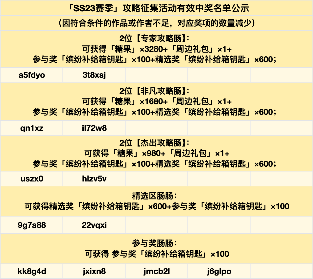 恭喜肠肠获得奖励~糖果与缤纷补给箱奖励将会在14个工作日内发放到邮箱,请注意查收(综合作品质量评定后,因符合条件的作品或作者不足,对应奖项的数量减少)!实物奖励届时请按照邮件内容添加发奖小助手QQ号留言正式服昵称+收件人+联系方式+收件地址领取,同时精选的攻略和同人作品已被移入至SS23精选子版块,肠肠们可以欣赏作品!