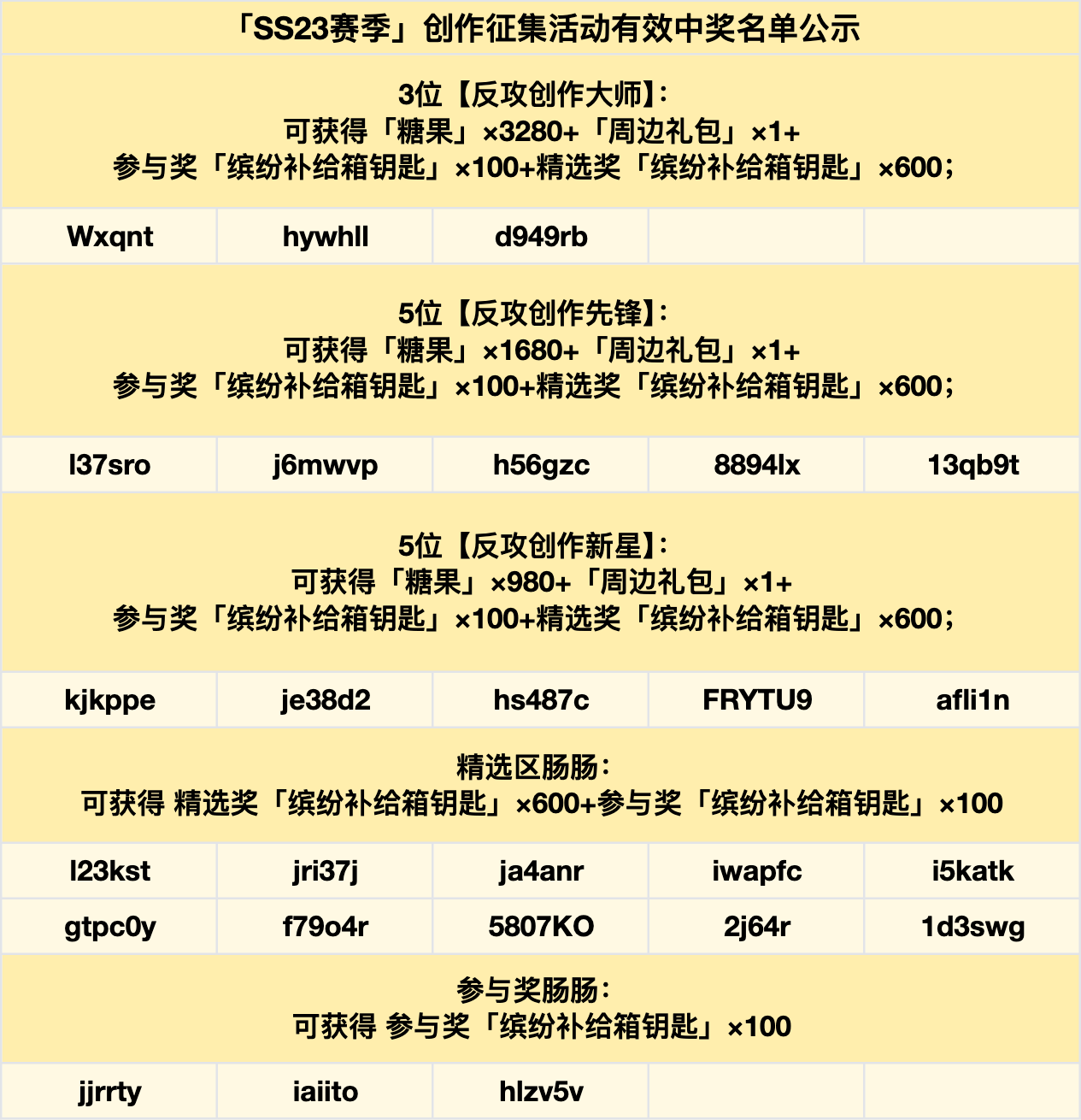 6. 肠肠有效参与本次活动即可获得【参与奖】,但作品需要符合上方【活动内容】板块中的攻略&创作内容需求并且符合SS23赛季主题和内容。