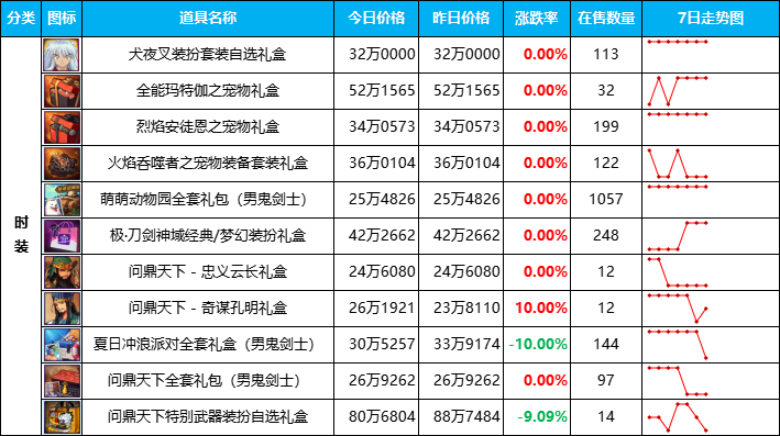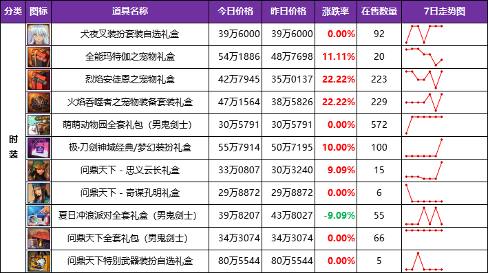1、【萌萌动物园】时装价格迎来上涨,粗略对比后全区上涨幅度在4~8%左右,幅度虽然不大,但全区在售数量都在减少,不排除其中因“到期下架”而带来的数值变动,总之时装礼盒近期波动巨大,要么跟风上架,要么继续观察市场走向,想捡漏时装的可以考虑入场了。