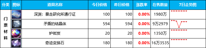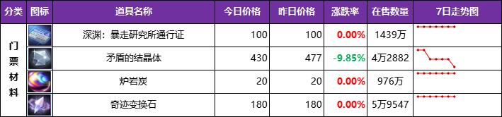 【幸运符】本周价格还在上涨,没有像上周预测的那样价格下跌,仓库中还有存货的这会可以大把赚泰拉了,前提是库存足够多;同样上涨的还有【装扮合成器】,但与其说涨价不如说回到上周前的价格,在售数量从上周2138件增加到3468件,市场竞争还是挺激烈的,最终要以多少价格出售看个人。