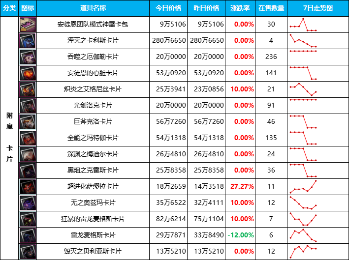 仅有几张附魔卡价格缓慢上涨,大部分还处于下跌趋势,其中下跌幅度最大是【卡利斯附魔卡】,从最初上架时的400W左右跌至如今的280W,但这个价格依然高攀不起,只能寄希望于大佬冲榜时能看上眼,未来价格还会持续走低;其他附魔随行就市吧,没什么悬念。