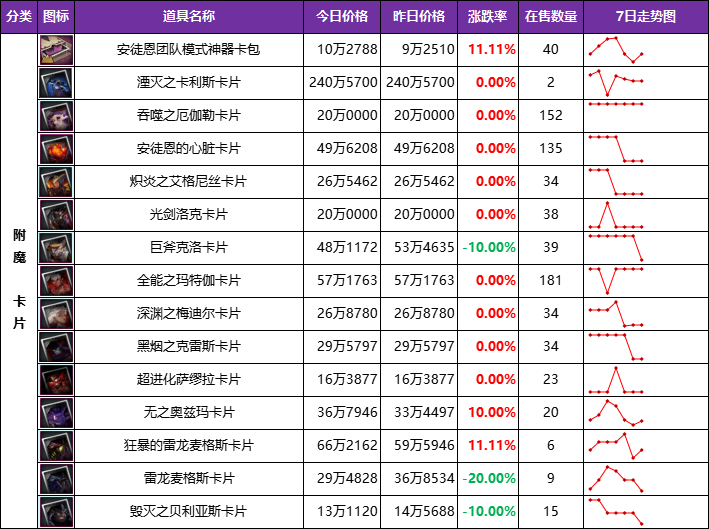 3、附魔卡全区持续走低,上周就说过,附魔卡不同于材料,它的消耗基本是一次性的,第一/第二梯队已经成型,第三梯队需求量也有限,闲散玩家更不会花几十万买张附魔,在错过最佳售卖期后,附魔卡很难迎来第二波需求,持续走低是必然现象,眼下是能卖就卖,别考虑什么赔钱,等过期被新附魔取代后,想卖都卖不掉。
