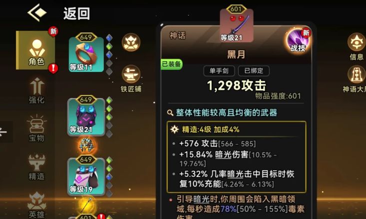 在衣服上面可以选择庇护战袍,获得198防御,还有2525生命。还有每5秒27点生命回复,在投弹之后三秒还能获得15.5%的减伤,生存能力是比较出色的。项链可以用浪潮,有405点固定攻击,还有679最大生命,并且还有4.08%的暴击率。更关键的是刻印效果在交替之后就能提升两种伤害类型26%的伤害,输出提升还是超级明显的。武器方面可以选择黑月单手剑,基础攻资是1298但可以获得15.84%的暗光伤害。