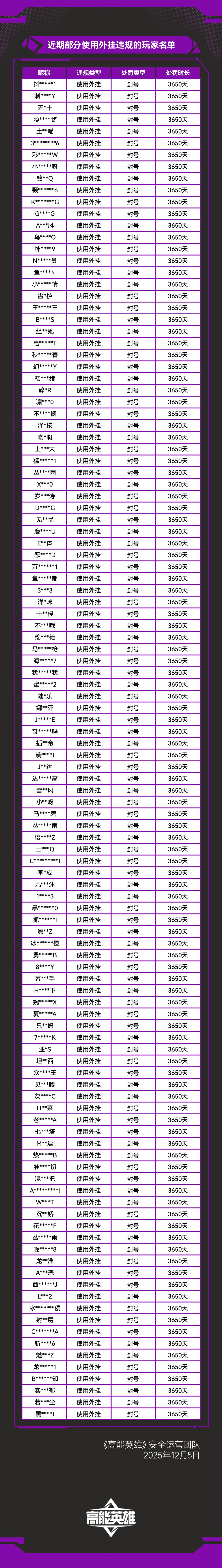 《高能英雄》外挂作弊处罚公告(12月5日)