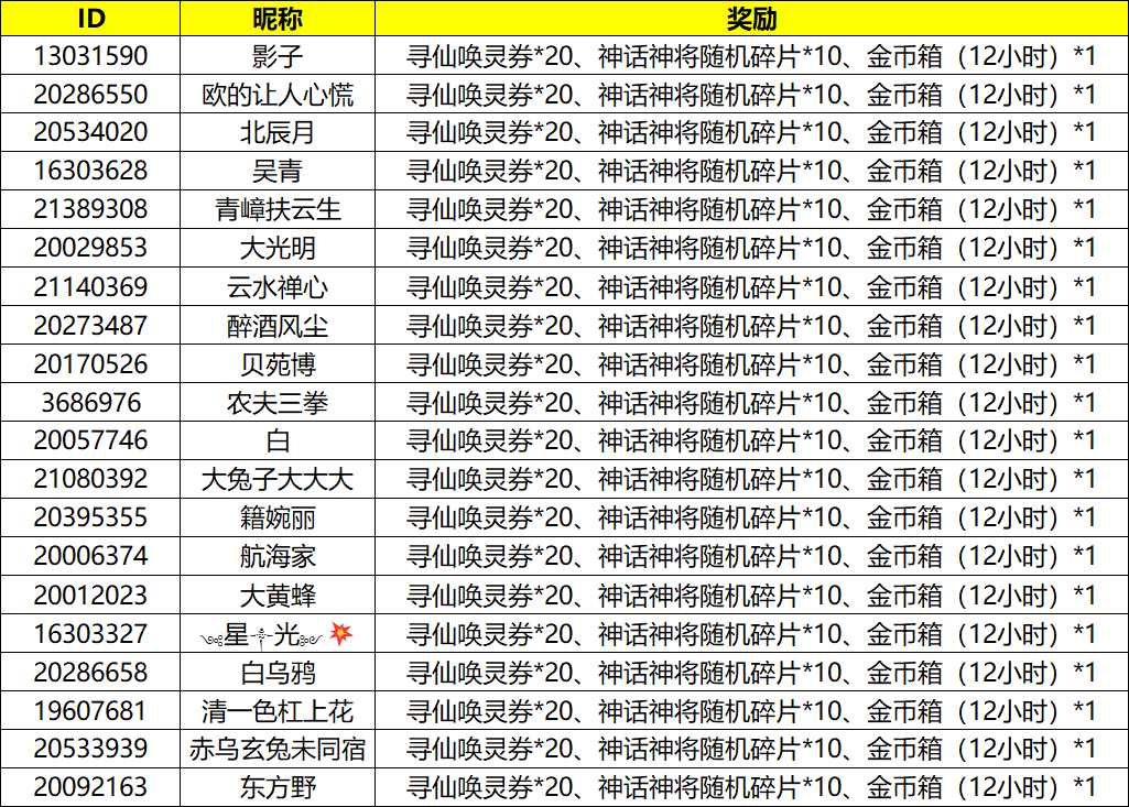 活动奖励:活动结束后将在本帖评论区随机抽取15名仙友送出“幸运礼包”(寻仙唤灵券*20、神话神将随机碎片*10、金币箱(12小时)*1)