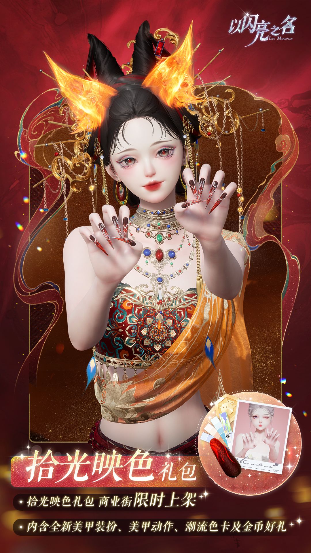 限时礼包售卖期间,合伙人可以4.6折的价格直接购买拾光映色美甲礼包,内含精美5星美甲套装【绯火流金】、精美美甲动态动作【执焰为誓】、潮流色卡*260和金币*52888,该礼包永久限购1次。