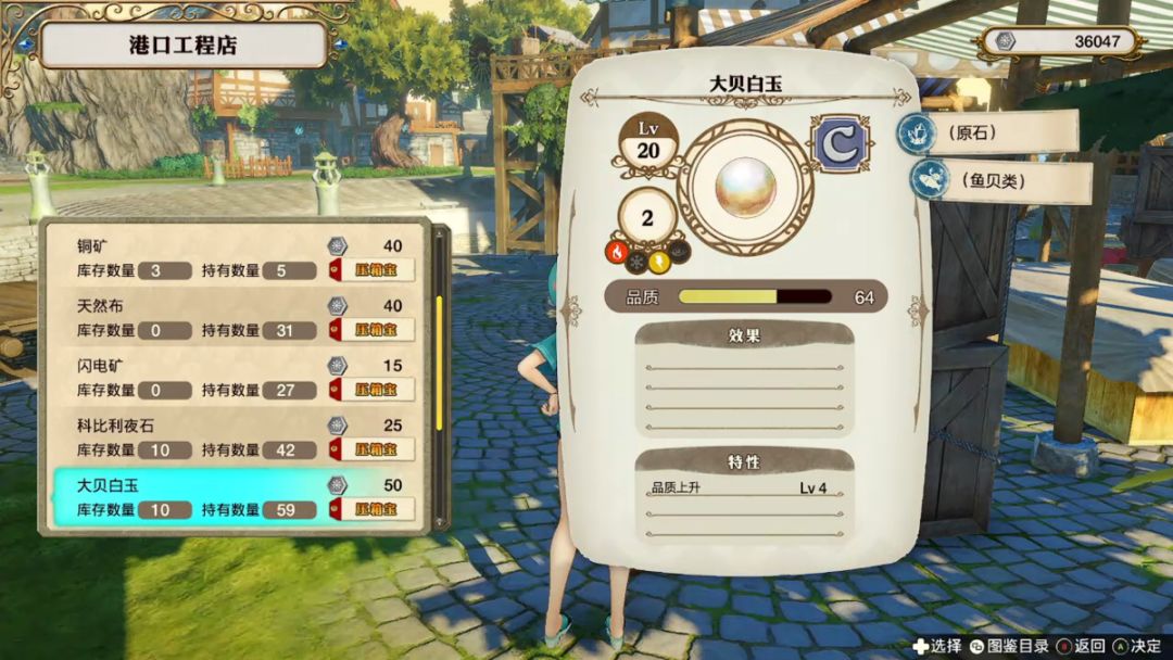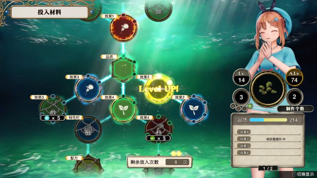 炼金工房系列的核心玩法就是搅大缸的调和了,而且也是从这一作开始,炼金的玩法难度降低了不少。在选择了想要调和的道具后,就开始丢所需的固定素材,调和的过程丢指定的素材会有变化。然后就是依照各种属性和下方的投入次数去丢,在有限的次数内会根据素材的品质产出不同提升各项效果的成品。