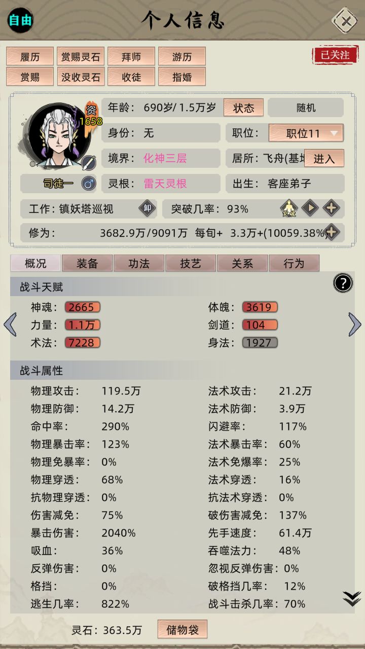 七、法修相关:法修血脉换成鬼神、人祖、司命,天赋体质、进阶异象、功法等围绕法术伤害相关、暴击命中先手相关、功法修炼速度相关进行选取即可,主输出功法为《黄泉升窍诀》或《大玄天章》,核心逻辑一致,套路大同小异。
