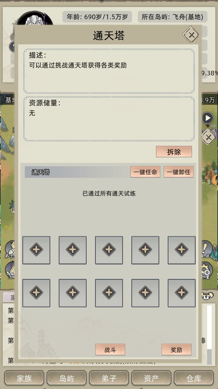 六、通天塔通关:打手培养完成后,单人一剑群秒即可通关通天塔,也许会出现一些随机不利因素未能通关,可以穿戴装备或一开始直接就培养多个打手。自由模式名人血脉下千年左右即可横扫一切敌。